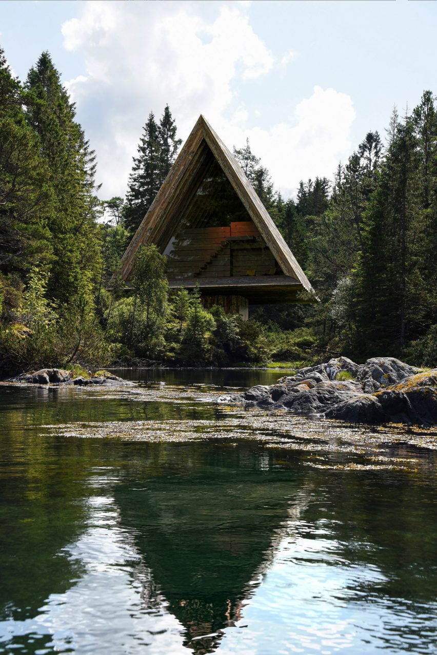 除了主住宅外,该团队还在岛屿的东岸设计了一座8米高的三角形客房。这座名为“木屋”的两居室住宅将由岛上砍伐的木材建造而成。