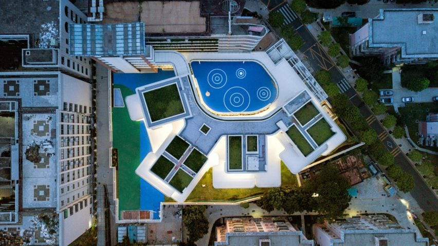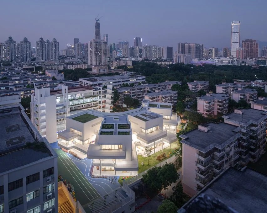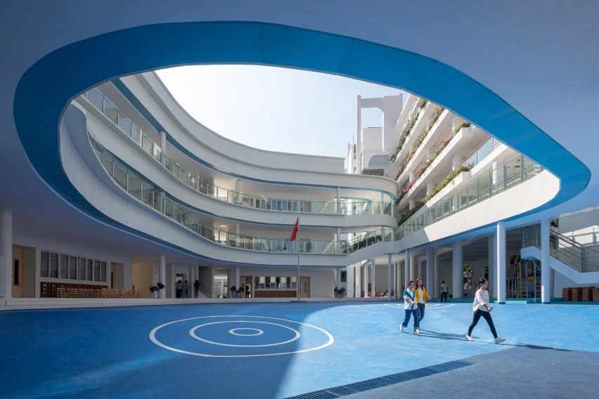 弯曲的阳台和户外学习空间是博物馆森林幼儿园(Kindergarten of Museum Forest)的特色,这是中国阿派朗建筑工作室(Atelier Apeiron)在深圳现有的幼儿园中添加的曲线建筑。
