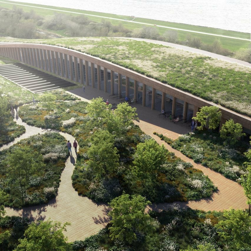 该建筑将被湿地栖息地和森林环绕,屋顶上有30,000平方米的草地,以增加场地的生物多样性。