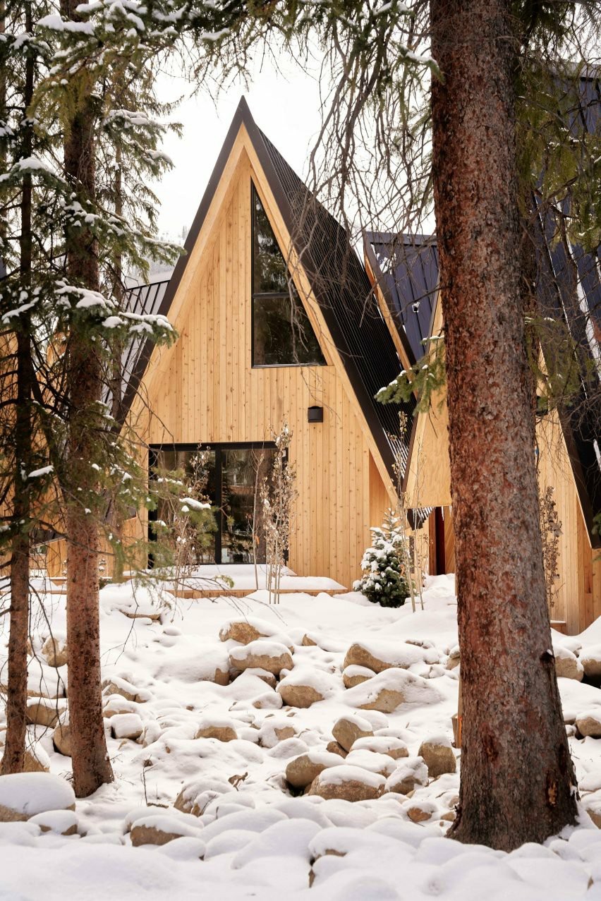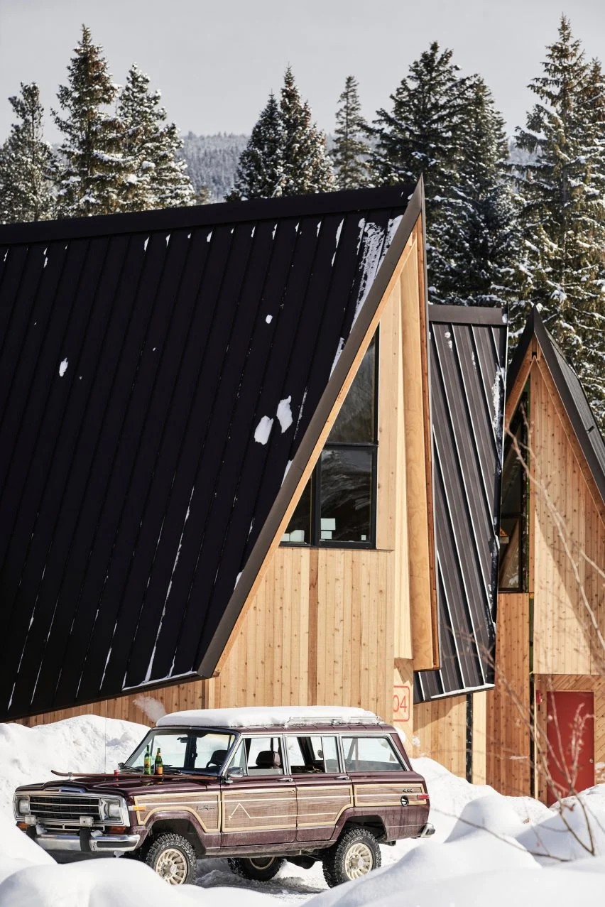 该工作室说,这个23450平方英尺(2180平方米)的接待项目“借鉴了20世纪70年代美国滑雪文化和那个时代标志性的A形框架小屋的设计灵感”。