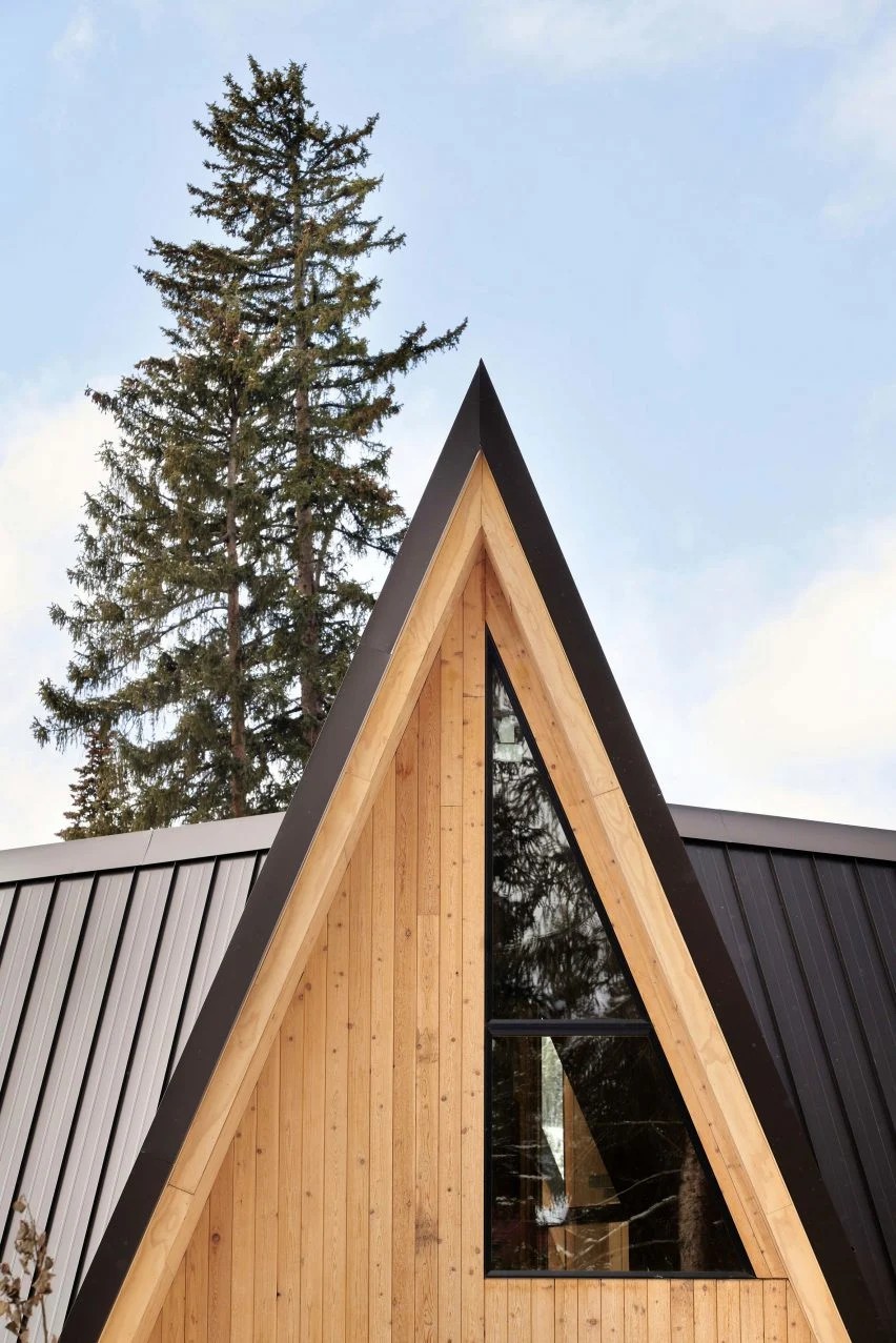 陡峭的黑色金属屋顶被温暖的垂直雪松板所取代。屋檐下的高三角窗将自然光引入室内,并可直接欣赏到山景。