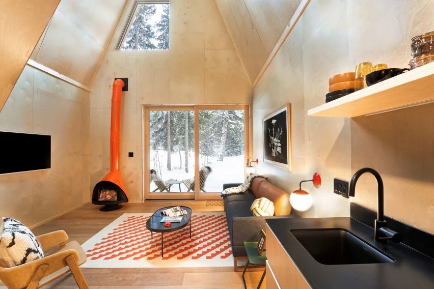预制方式使设计团队能够将小屋布置在成熟的常青树周围,将它们与滑雪小镇的城市结构联系起来,并通过有效的实践和系统限制材料浪费。