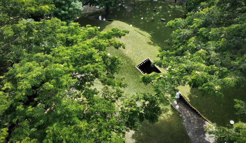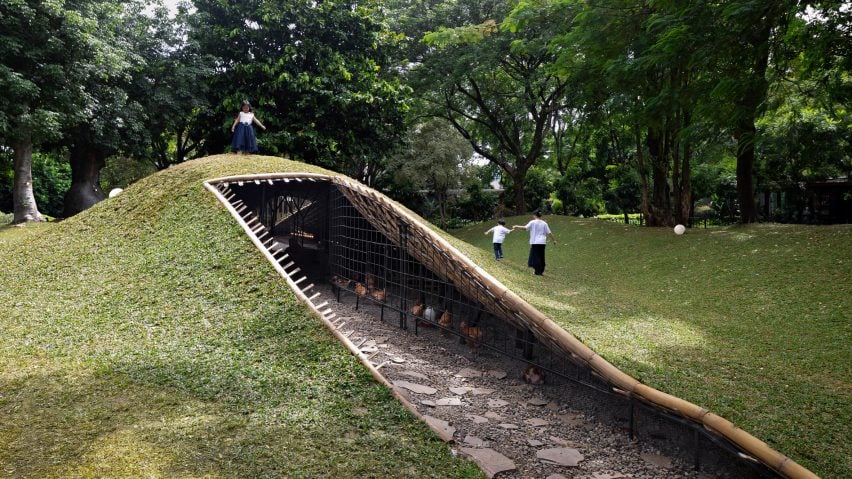 巴厘岛RAD+ar建筑工作室在印度尼西亚雅加达的一个公园里的一个人工山下,设计了一个类似山丘的隐藏的竹鸡舍。