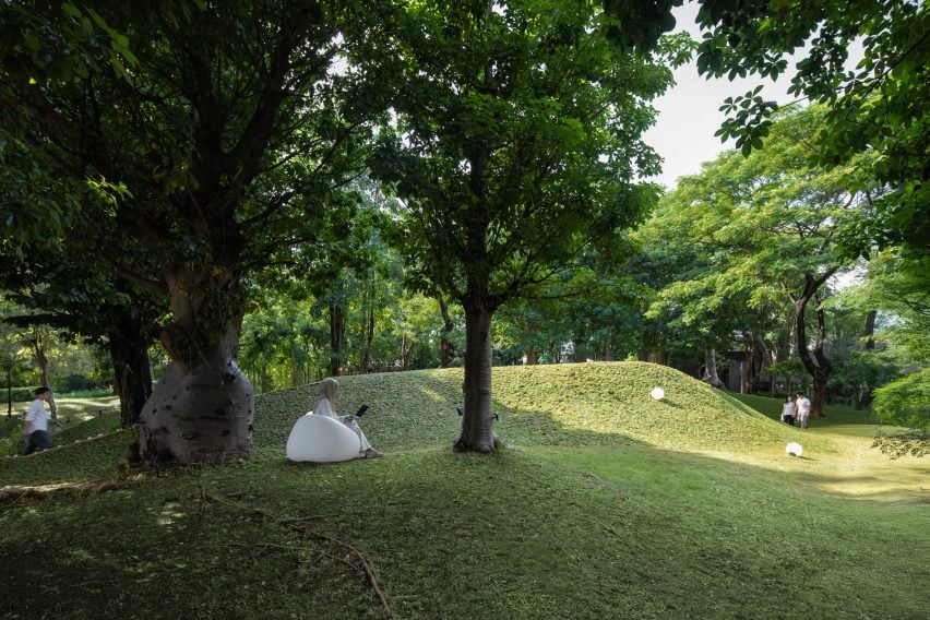 框架由一系列竹子和钢柱支撑,上面覆盖着草皮,看起来像一座小山。