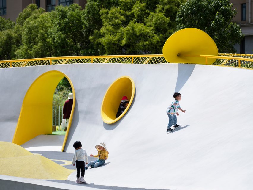 由SoBA工作室完成的这座位于中国昆山的城市公园,黄色的色调使观景台、表演区和游乐空间变得生动起来。