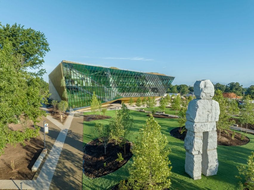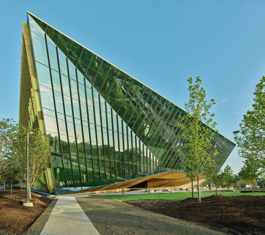 这个医学院是一栋四层楼高的建筑,有一个倾斜的形状和倾斜的屋顶公园,公园由纽约战略设计工作室(Office of Strategy+Design)设计,据该团队称,该公园是根据周围的“奥扎克地质”情况设计的。