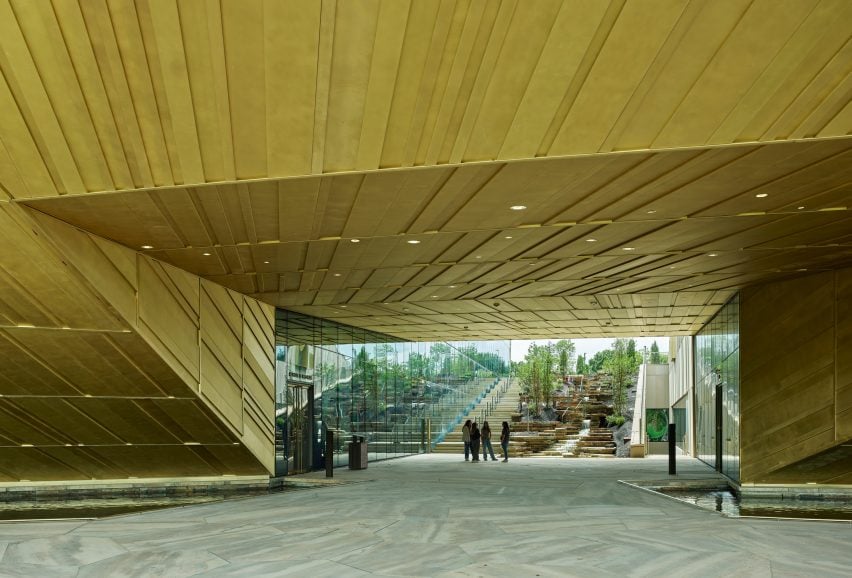 屋顶公园覆盖着一只“胳膊”,它向后延伸,向下倾斜,与地面相接。