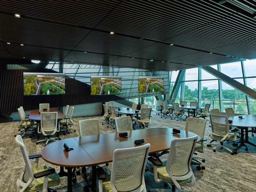 另一只“手臂”由一个长方形的玻璃形状组成,通向屋顶,俯瞰内部庭院和周围的校园。