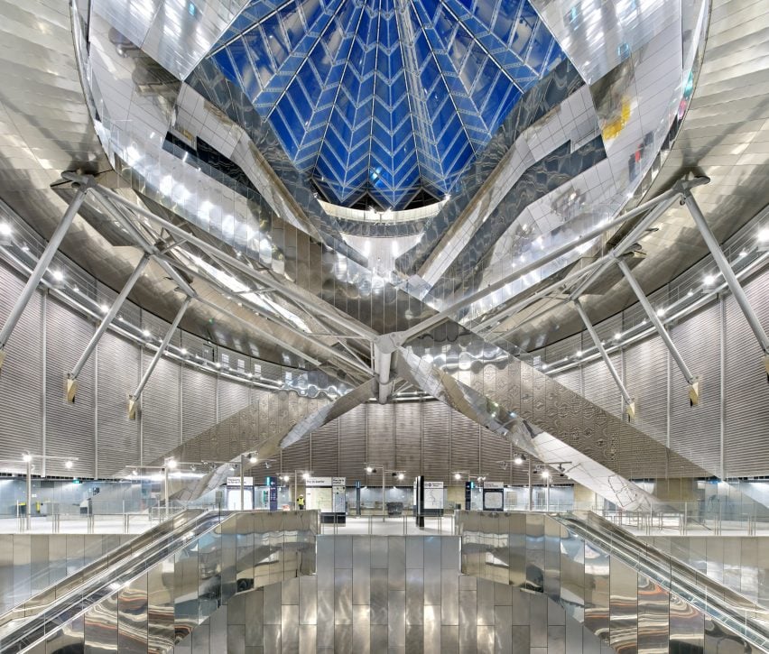 从地面上看,车站就像一个玻璃亭,螺旋玻璃屋顶由三层组成。这个透明的盖子允许光线穿透下面的空隙,挑战了乘客对地下意味着什么的理解。