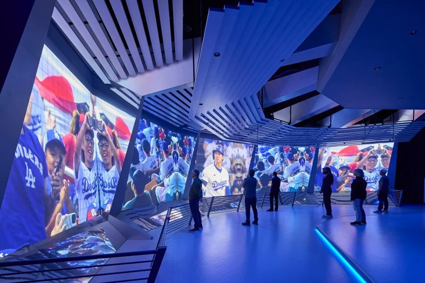 在峡谷般的入口墙上,巨大的LED屏幕被编程为显示与美国相关的图像,如戴牛仔帽的骑手和叠加的美国国旗。