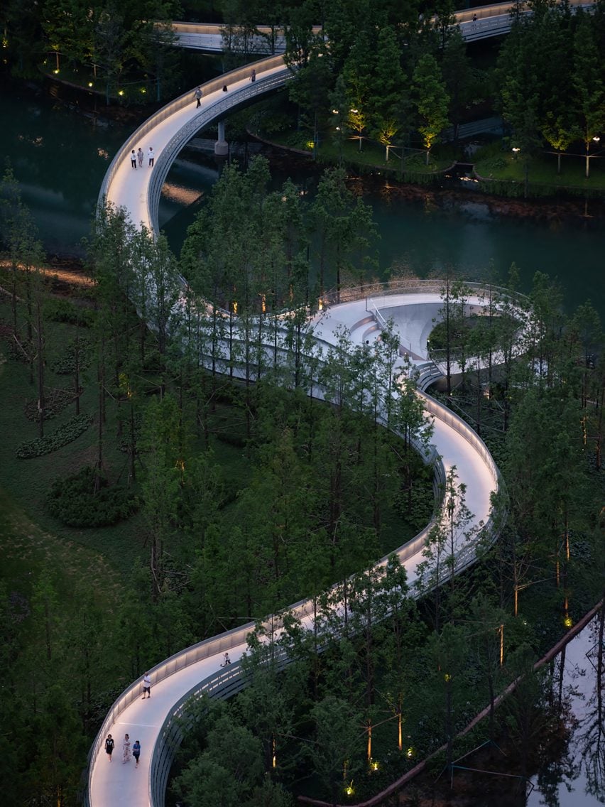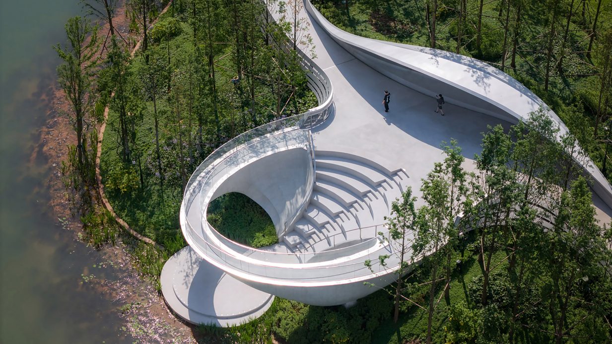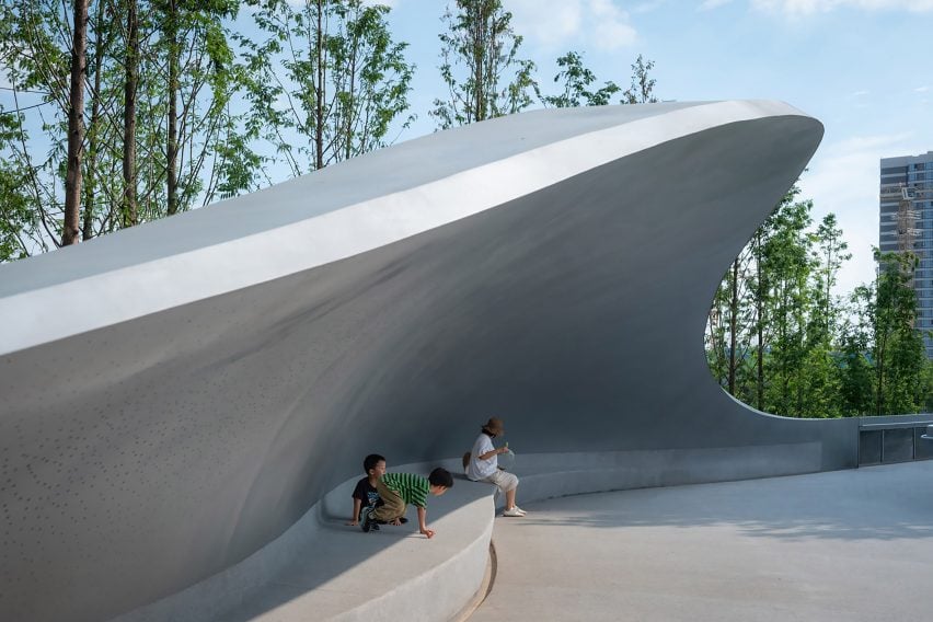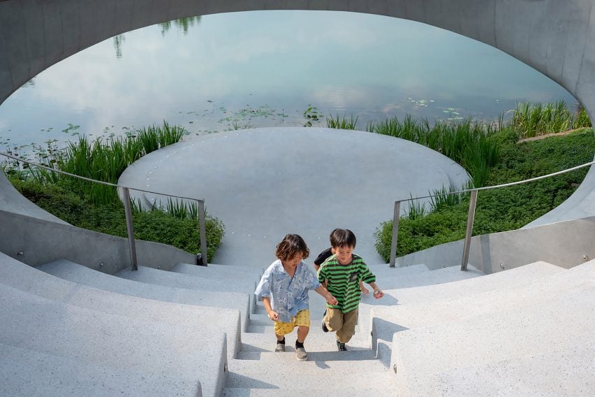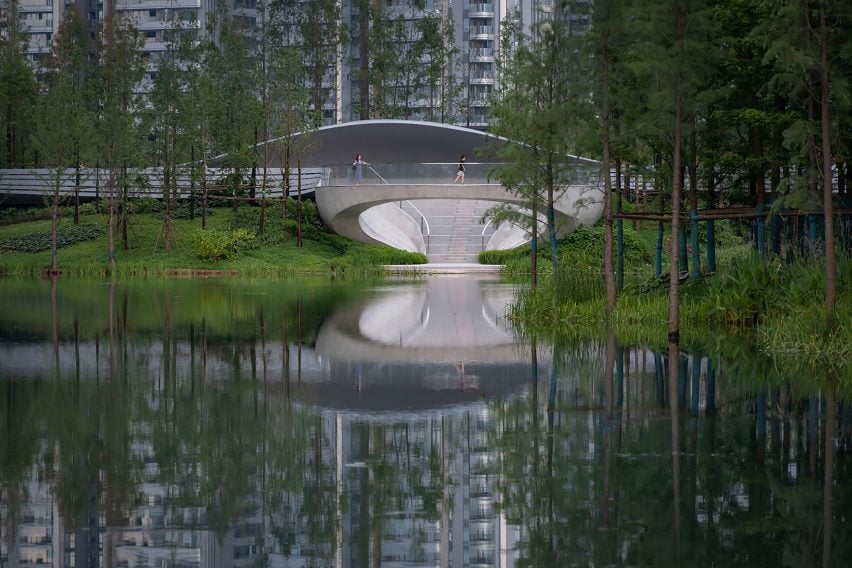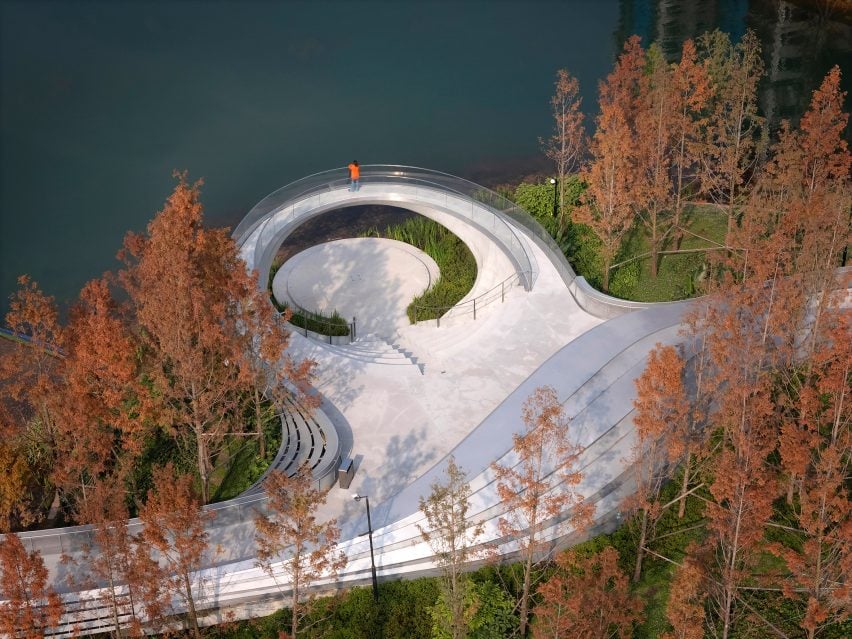 林再国工作室的首席建筑师林再国(Lin Zaiguo)说:“它被设计成公园流通的一个暂停点,在提供框架景观、噪音防护和与自然无缝连接的同时,促进互动和沉思。”