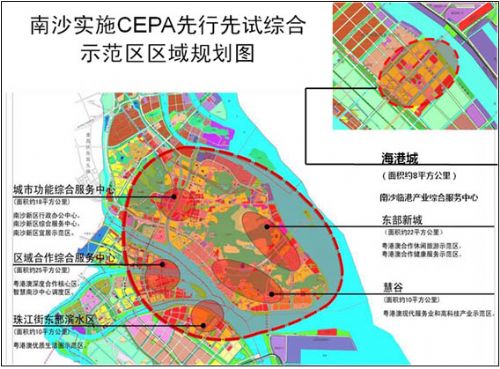 张广宁介绍,按照成熟一片、启动一片的要求,结合目前开发条件,确定南沙新区“实施C E PA先行先试综合示范区起步区”约为60平方公里,近期启动三个片区。即,北部以庆盛交通枢纽为依托的教育培训、创新、高端医疗合作区;中部以明珠湾城中心区为依托的商业服务和金融创新合作区;南部以珠江交通枢纽为依托的粤港澳数据特区和战略性新兴产业合作区。这三个片区将构建南沙新区近期以“一中心、两枢纽”为基础的粤港澳区域合作格局。