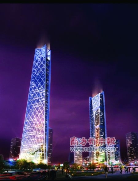 该方案将为南站东北侧的两地块整体考虑,分别为350米和300米的超高层双子塔,两幢塔楼朝向南站入口方向形成欢迎之手势,共同构成了南站核心商务区的门户形象。其中,主楼的建筑形态借鉴南方地区的春笋形象,螺旋状线条上升的同时标准层平面缩进,获得了优美建筑形态,并降低了超高层的风荷载,有利于超高层建筑的结构稳定性。