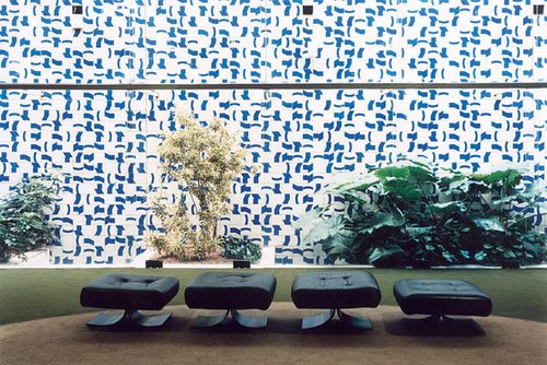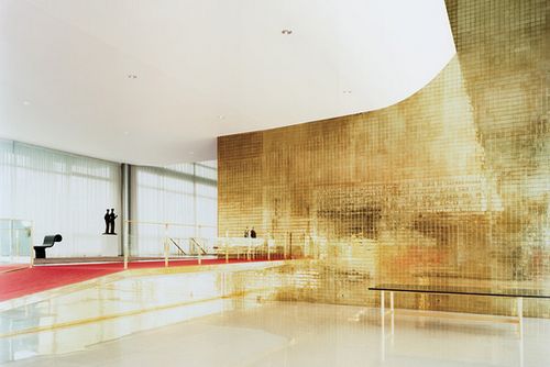 4、巴西国会厅堂里的由尼迈耶设计的皮凳子和和由阿索斯-布卡奥(Athos Bulcao)设计的花砖墙。