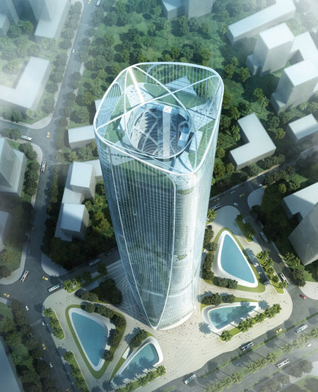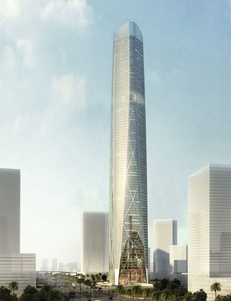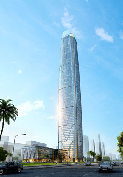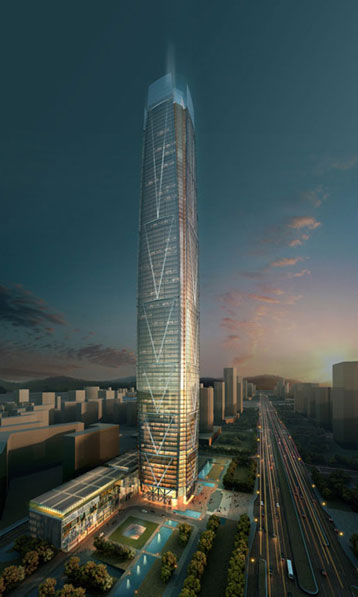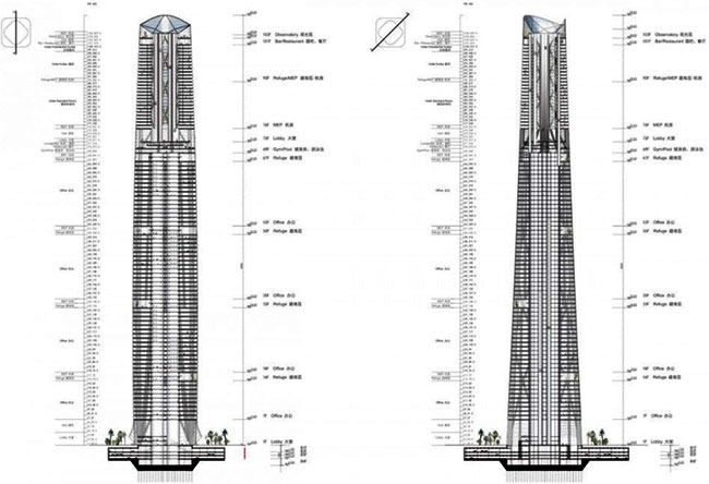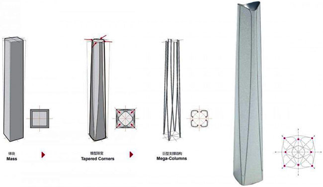创意:建筑师从塔楼最经济、最高效的尺度出发,决定塔楼底层边长约66米,再用环绕平面的8根巨柱及巨型斜撑保证塔身稳定。这8根巨型钢柱环绕内部空间,相互靠拢,形成连续的巨型三角形稳定结构。在设计过程中发现,这个结构的形状具有一种安静和谐的美感,同时又拥有发展变化的可能性,就像一朵含苞待放的莲花,静静地等待着下一步的生长。在每一个三角形稳定结构的内部,工程师再次用巨型带状桁架连接两条长边,这些桁架在避难层与8根巨柱相连确保了整个塔身的基本结构的整体刚度。