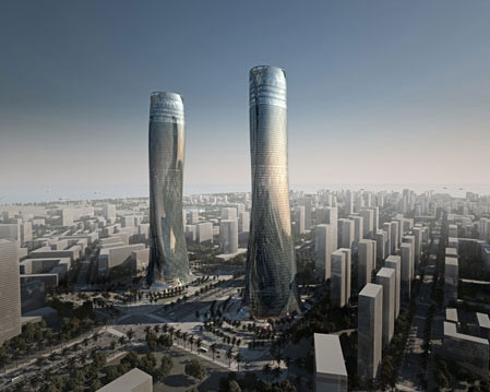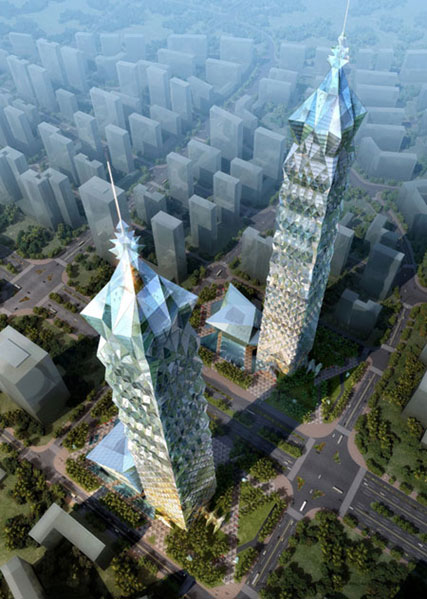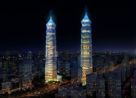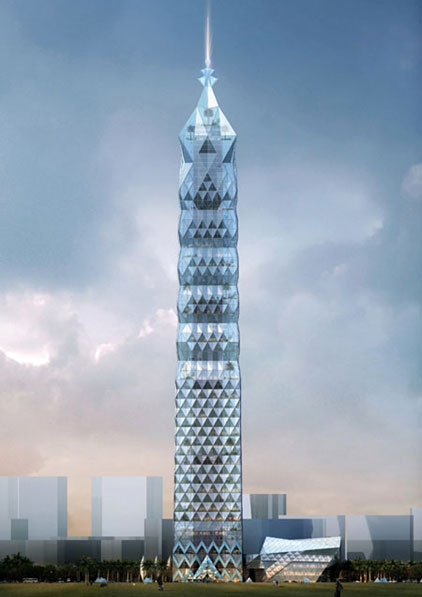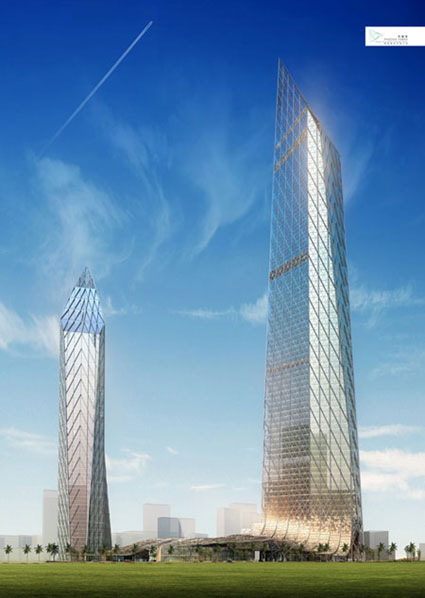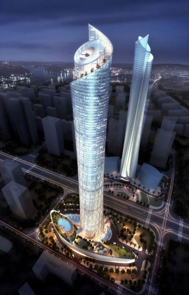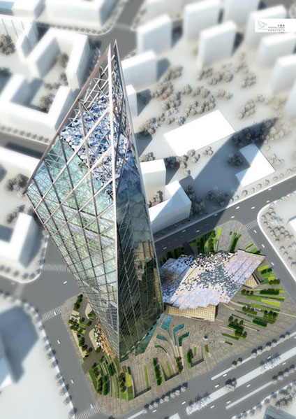 创意:大厦优雅的曲线与弧线的造型犹如含苞欲放的花朵,其整体外型是直接反应建筑功能需求下所创造的成果——经由变化楼板的型态來回应不同使用功能的需求。扩大的塔楼底部的轮廓形状提供了一系列富于变化的办公与酒店入口大堂。
