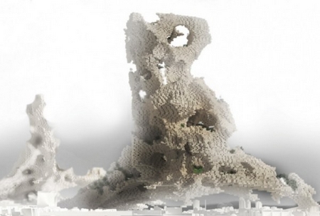 第二名:虫群之心——来自 Darius Ma?koff 和 Elodie Godo 的作品。灵感来自于白蚁的巢穴。建筑材料采用的工业废料。特点是能够按照居住者的要求变化使用空间。