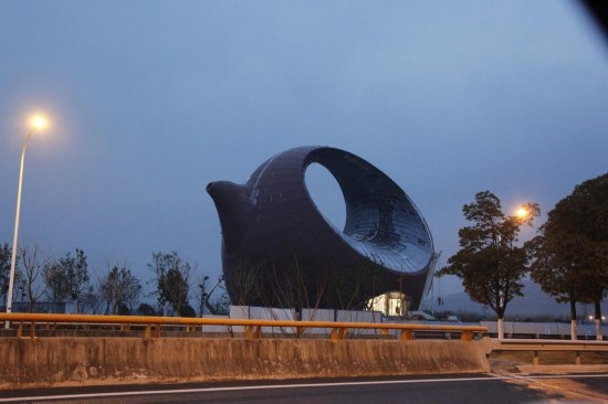 1、无锡“紫砂壶”。一座紫砂壶形状的建筑。圆滚滚的外形,向内凹起的弧度曲线,中间被掏空,建筑的中上部还有一只“撅”起的“嘴巴”,这是位于蠡湖大道具区路附近的一个正在建造中建筑,形状就是一个巨大的紫砂壶。
