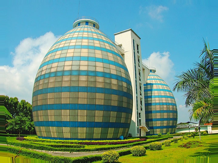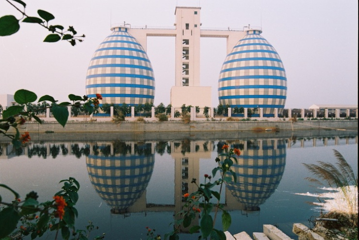 2、漳州污水处理厂建筑。从照片上看,这座建筑是两座球形的大厦并排站在一起,中间由方形的天梯连接在一起。网友“@漳州飞鱼”打趣说:不知道设计者什么创意,反正我觉得它有点下垂、臃肿。