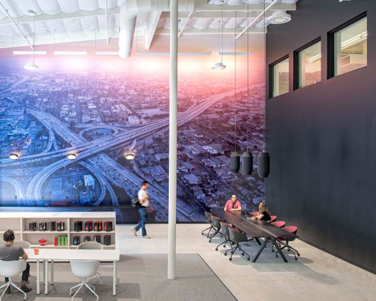 由加利福尼亚的室内设计公司 Bestor Architecture 为 Beats By Dre 操刀的公司办公室设计项目彰显了国际范公司一贯的开放、自由和舒适的环境和氛围。项目地址位于洛杉矶以西的卡尔费城,公司面积足足9000平方米。其中除了必要的办公场地外咖啡厅和休息室、会议室等一应俱全,不同的分区被赋予了不同的主色调能够与分区内的氛围融为一体。