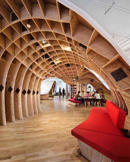 Arent Fox 原本打算简简单单地修复,按原样不做太大改变。但就在那时,Pei Cobb Freed 建筑竟然在底层挖了一个洞。由于建筑的伞形顶饰,有机会怂恿律师事务所在这栋12 层建筑的7 个楼层内做线形木板的扭曲设计。事务所开始了繁忙的设计工作,社交空间表达了公司自称的“特立独行的机会均等”文化。