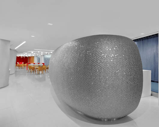 这是由美国Clive Wilkinson建筑事务所完成的办公室设计。在这个明亮的色调之中,完成了工作区间串联,使得有限的办公空间得到更好的利用。这个巨长的桌子总共使用了 870 片独特的胶板,外层先涂裹上带有金属光泽的白色烤漆,再经由长达 30 小时的融和过程,製造出一个表面无缝的绵延桌体,另外,绵延的范围还延伸到了外围区域,搭配著如同鸡蛋盒般的弯曲形体,以屏蔽出会议室、休息室或是储存区的空间。