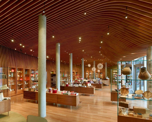 一系列平行的樱桃木胶合板肋条直接由当地的建筑信息模型制造,木材采自欧扎克本地,这些肋条共同组成了空间,形成了天花板和后墙上的木工产品。224根独特的木肋条由CNC铣削技术精确切割而成。建筑内表面的肋条很像蘑菇底面的一条条菌褶,被称为薄板,这些薄板高低起伏,形成了优雅的断面,同时也有实际作用——遮挡强烈的西晒。薄板系统的多孔性和规则性为供暖与制冷系统、照明灯具与悬挂商品提供了固有的灵活性。带有纹理的绿色织物覆盖的展示墙是零售店的端墙,也与樱桃木地板和薄板表面协调统一。薄板的形式与结构试图与博物馆的美感产生共鸣,协调原有粗糙的曲线型空间和零售店的实际需要。