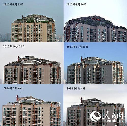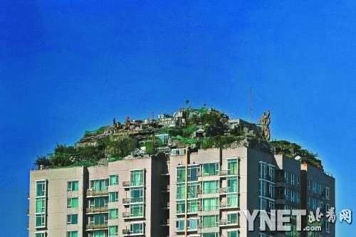4月22日,曾经引起轰动的北京“最牛违建”人济山庄B座楼顶边缘最近又被种上了灌木。记者在现场看到,B座楼顶东南角被灌木镶了一层“绿边”。同时,楼顶有几名工人正在施工。