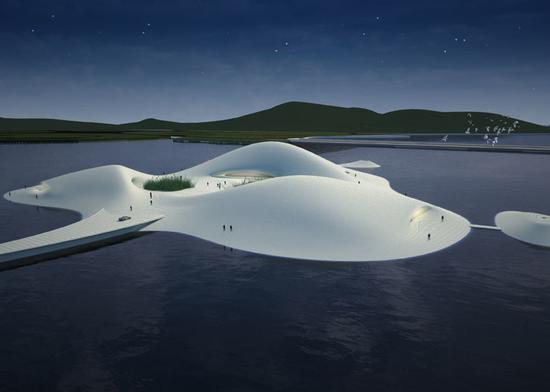 这是 MAD 设计的第三座博物馆建筑,位于福建省第一大岛平潭新城中心的内海,落成后也将是亚洲最大的私人博物馆,建筑面积为四万平方米,总投资约 8 亿人民币。 博物馆建筑本身就像是一座随时要游离的岛中之岛,由一座微微起伏的栈桥连接着大陆。它像是置于水中的大地景观,与远山借景、呼应。建筑以混凝土混合当地沙地贝壳整体浇筑,如山峦起伏的壳体笼罩的室内空间好像是远古的洞穴。