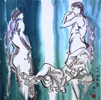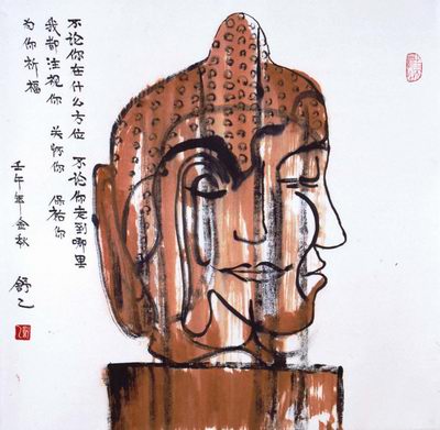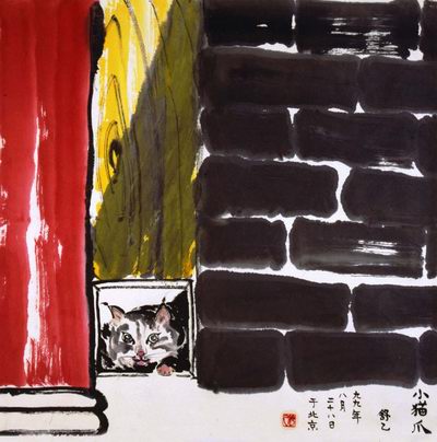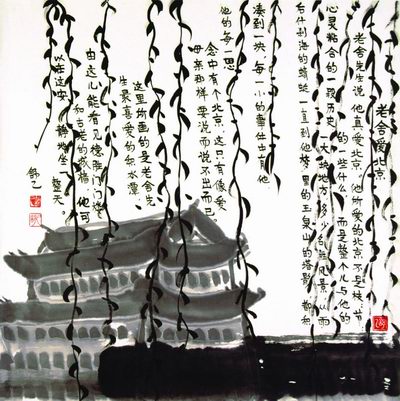我又看到一段北京普通民居的旧墙,在旧墙远处耸立着一个破旧的城楼。是以前的德胜门?是东便门?还是没有拆除以前的西直门?不得而知,但是这只有住在它附近的居民才会在自己的院落里见到这种景象。舒乙说这是他长久以来经常出现的回忆。他小时候,一抬头就见到这个城楼。我想这真是“老北京”才会有的情结,但它如此亲切,让我们的手能摸到了“老北京、老住户”们的情结,触摸到了他们的依恋和怀念。我似乎呼吸到了老北京城的空气。这张画又是既谈不上构图精妙,也谈不上笔墨的情趣,但是我却闻到了一种浓浓的怀旧气息。罗丹说:“如果你感动了,那就不用问他的技巧好坏了,那技巧肯定是好的。”这样的好画实在不胜枚举,那条树影斑驳的走廊,那敦煌佛国的菩萨和他独特的心解,还有聪颖善良的女孩,还有,还有……那令人战慄的激情, 还有只是极简练的几笔,几乎是构成主义。