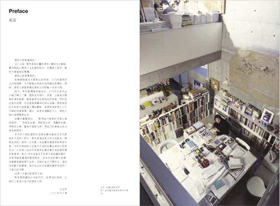 翻开书的第一张照片——办公室中,安藤坐在桌前半仰着头,用他一向特别有神的眼睛凝视二楼的摄影者,周围是三层高,堆满图书的书架,身后,淡路梦舞台的模型几乎占据了一面墙。虽然照片的大部分被办公室中杂乱的景物所占据,但印象最深的还是安藤的那双深邃的眼睛,那是充满着洞察力的眼睛。正是这双眼睛通过感受把美的讯息通过建筑展现给我们。