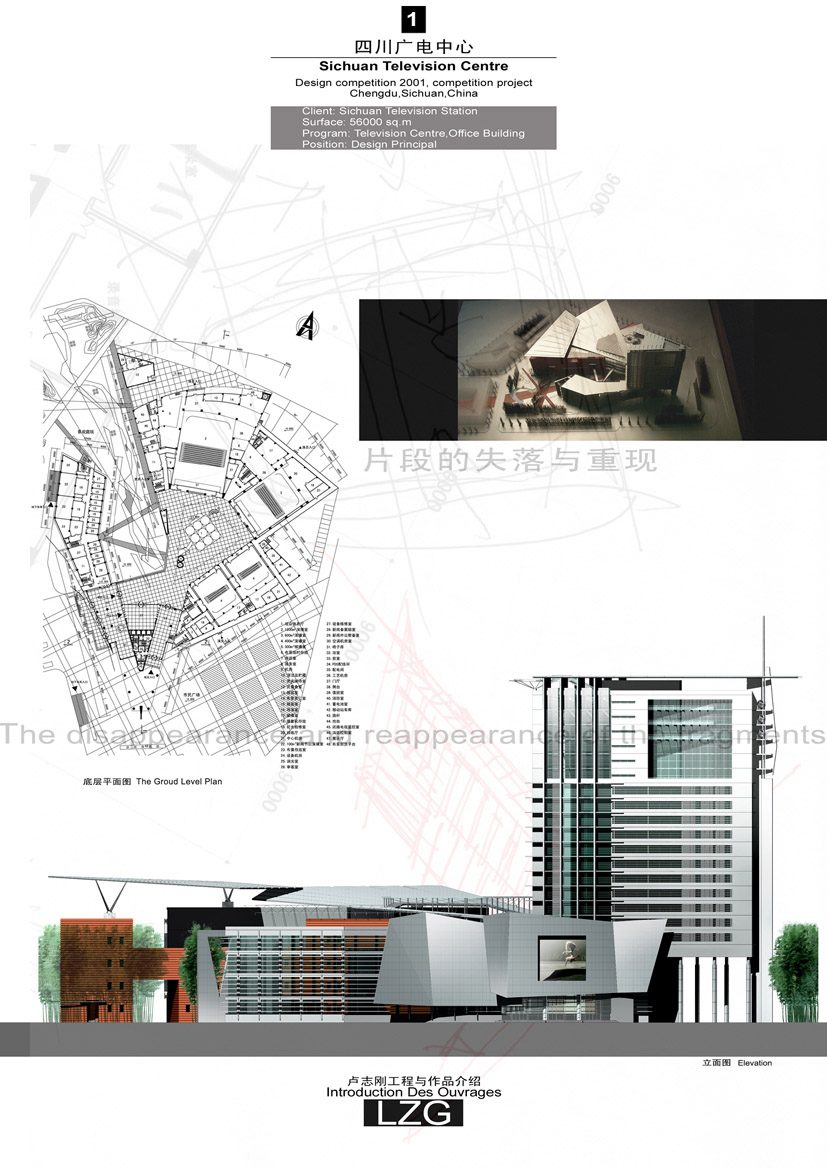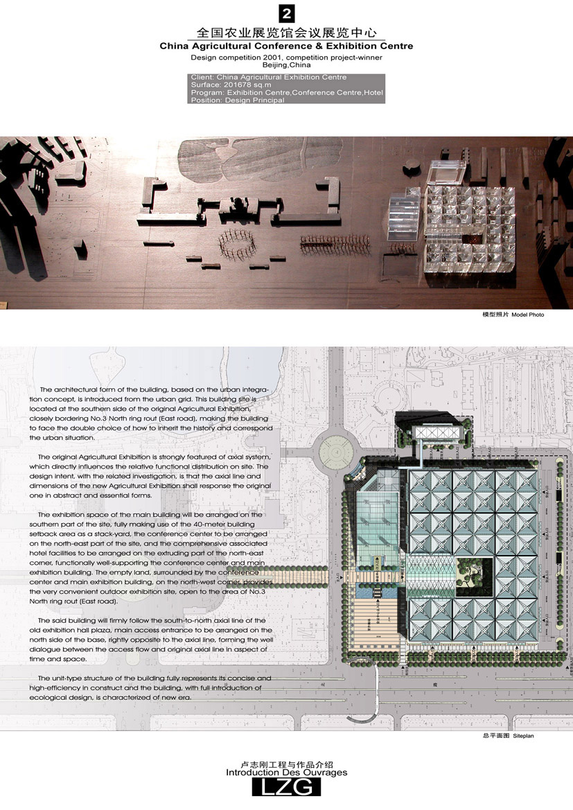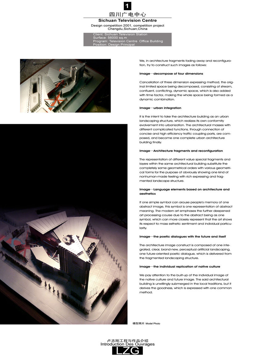 ·西安高科广场(方案)·上海大学体育中心(中标 已实施)·西漕旧区改造修建性详规(中标 实施中)·东上海花园概念设计(中标 实施中)·中国驻韩国大使馆(中标 实施中)·上海松江行政中心总体规划与单体设计(中标 实施中)·上海浦东国际商厦(中标 实施中)·上海高级人民法院审判法庭办公楼(中标 实施中)·重庆有线电视大厦全国方案竞赛(第一名 实施中)·上海虹桥世纪健康城公开设计竞赛(第一名 实施中)·四川广电中心(2001年 主创)