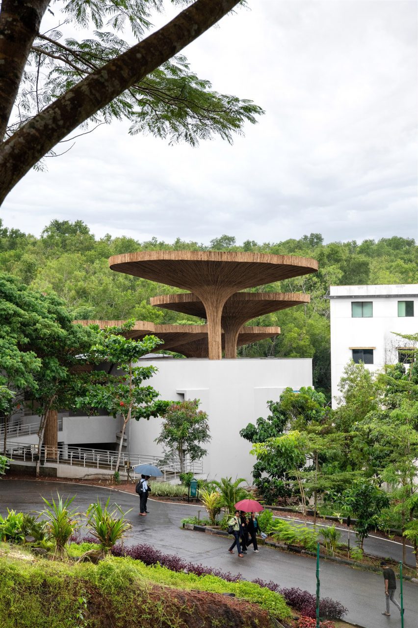 这所商学院位于印度西南部的社交中心,一顶覆盖着竹子的遮阳伞为其提供了庇护,当地的紫墨工作室(The Purple Ink Studio)设计了这座建筑,以挑战传统的学院建筑。