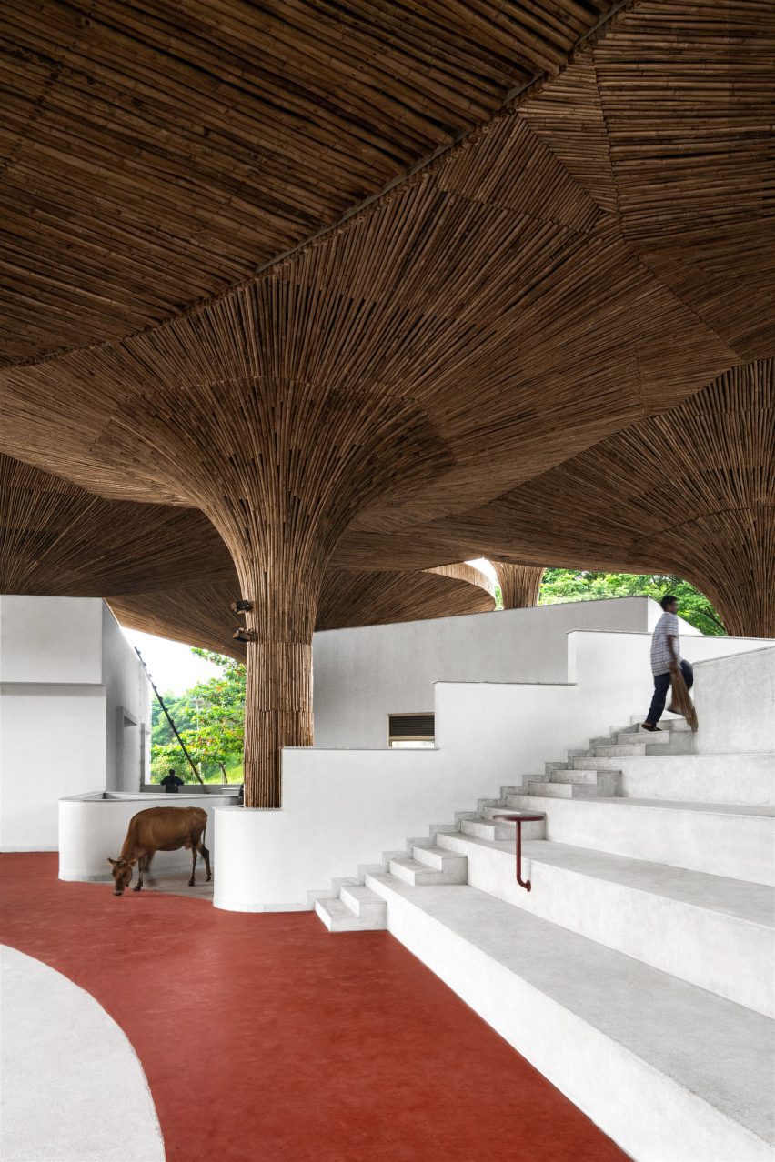 延伸部分上方长出了十一把雨伞,它们位于不同的高度,以模仿山谷中附近的树冠。它们一起形成了一个覆盖物,由桁架连接在一起的钢结构制成,然后用现场手工切割的竹竿覆盖。