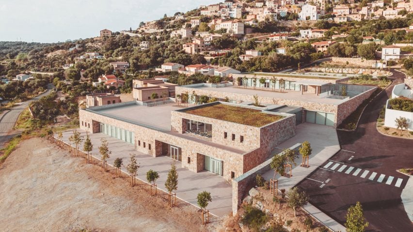 这座占地2300平方米的幼儿园、小学和文化中心位于沿海村庄卢米奥(Lumio),沿着一系列直线建筑的斜坡向下延伸,顶部是俯瞰大海的游乐场露台。