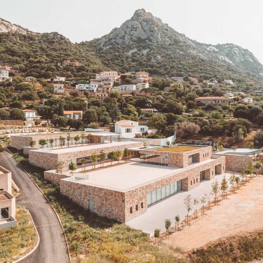 法国阿米莉亚-塔维拉工作室(Amelia Tavella Architectes)使用不规则的花岗岩块来覆盖埃德蒙-西梅奥尼学校和文化空间(Edmond Simeoni School and Cultural Space),参考了这种石头在科西嘉岛的崎岖环境。