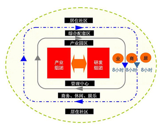 既能办公,也能生活;集总部办公、研发孵化、展览展示于一体;生产、生活、公共服务共同发展,以上理念均表达了功能复合化的规划思路。苏州纳米产业孵化基地中的配套及服务比例,已达到15.5%,而比较国内外多个高新科技产业园,综合配套的比例也在10%~45%不等。因此,产业园的功能构成理念认为营造一个业、商、居一体化复合开发的产业园(图1),才能够充分满足人们生产及生活多种日常活动的需求。