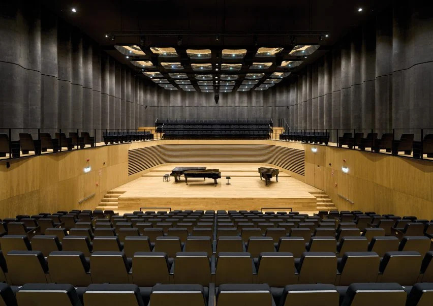 SLAS 工作室使用钢筋混凝土建造音乐厅的结构,礼堂的墙壁由波浪形模板形成。在这里,混凝土被暴露在外,并涂上了黑釉漆,从而消除了额外的声学覆层的需要。