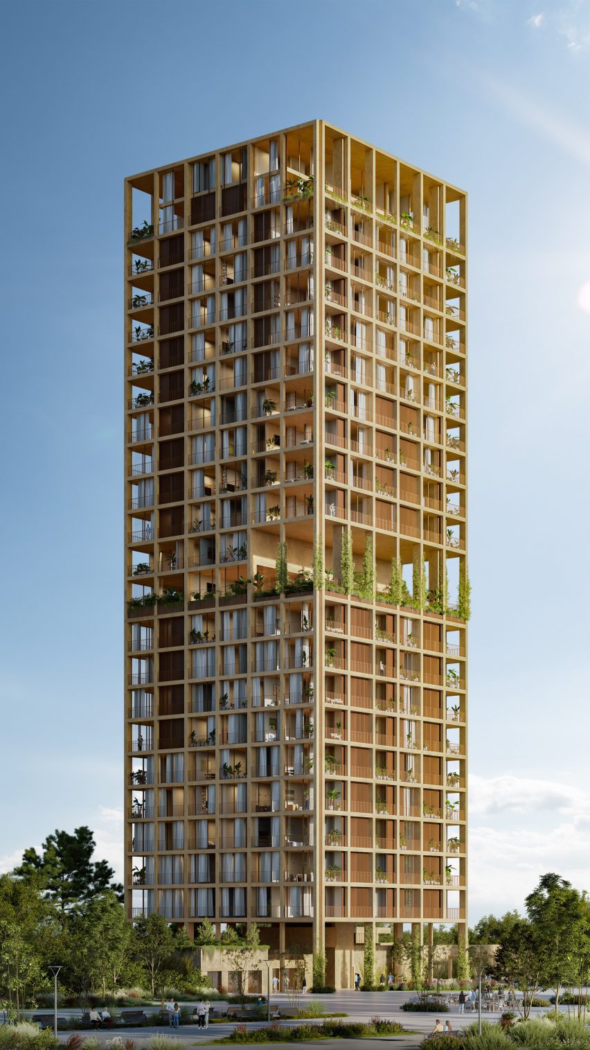 效果图显示了一座被网格混凝土立面包裹的塔楼。对称的方形阳台环绕着建筑的核心,而其地面和上层则略有延伸。