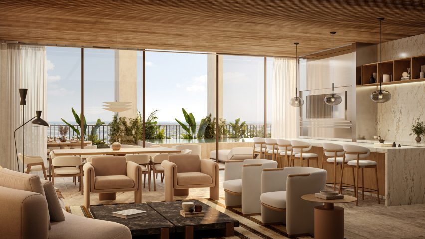 室内效果图显示了中性色调的家具,整个房间都使用了暖色调的木材和石头。