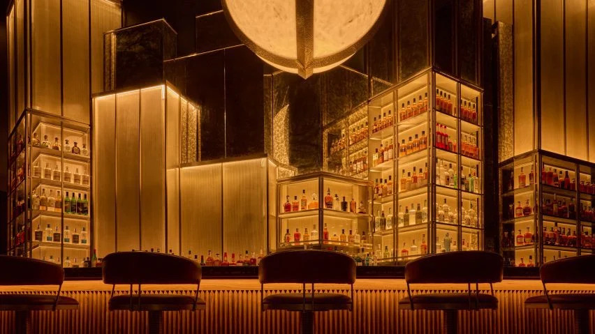 其中包括主酒吧区,后面是高大的发光展示柜,与他们面对的天际线相呼应。柜台上方挂着一盏巨大的球形灯,在坐在软垫酒吧凳上的人身上发出柔和的光芒。