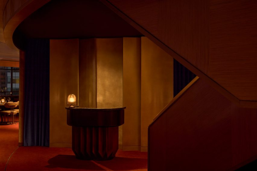 这一层的地毯和室内装潢是浓郁的海军蓝,而楼下的颜色则换成了深红色,让人想起已故电影导演大卫-林奇(David Lynch)喜欢的内饰。