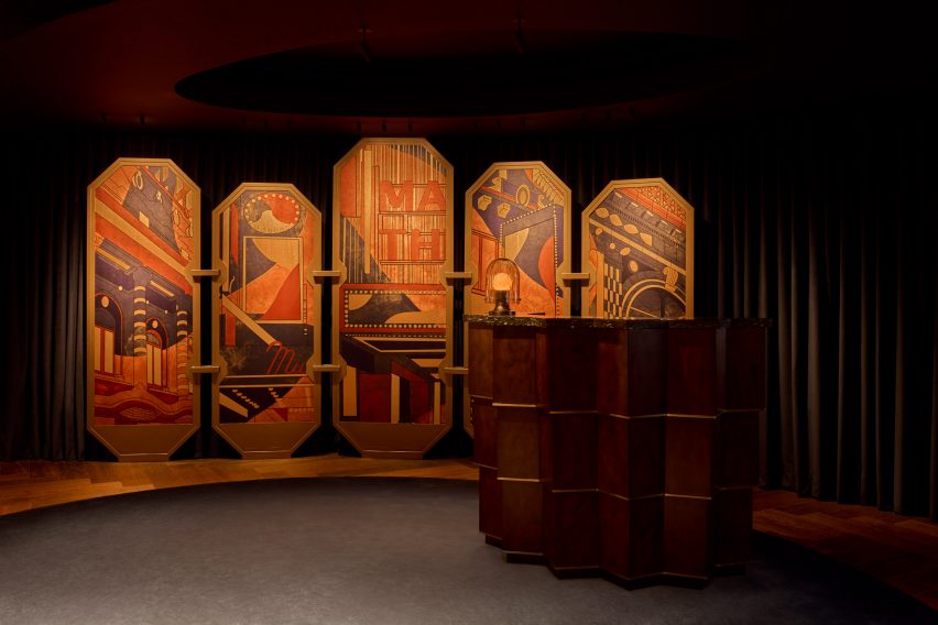 包括有光泽的威尼斯石膏、刻面古董镜和让人联想到舞台窗帘的深天鹅绒蓝色窗帘在内的材料都为戏剧氛围增添了色彩。