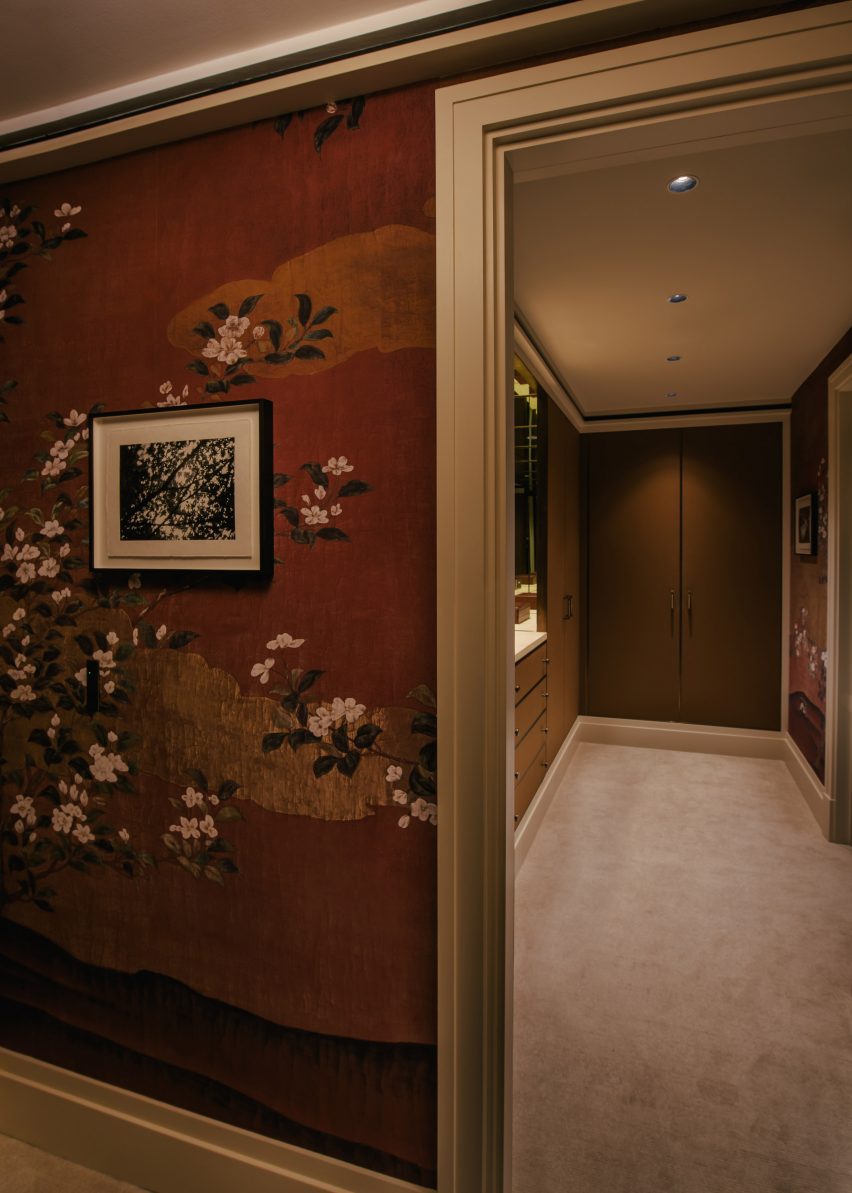 在主卧室外,一张红色背景上手绘白色花朵的丝绸壁纸增添了装饰性和“戏剧时刻”。