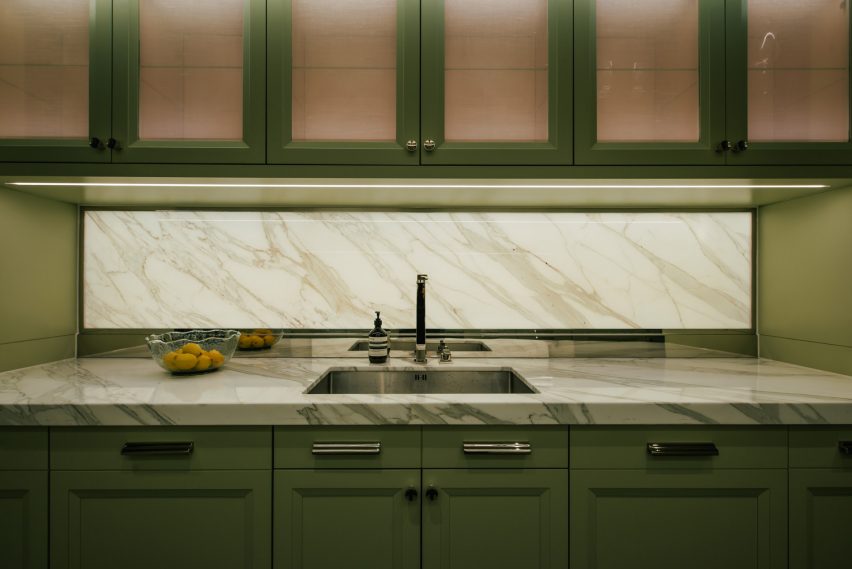 冯斯坦解释说:“我们墙壁和天花板上的底色是中性的,但绿色、梯田和黄色都来自大自然,它们代表了我们工作中的一个持续标记,真正为整个公寓增添了丰富的温暖;柔和而丰富,但并不令人难以抗拒。”