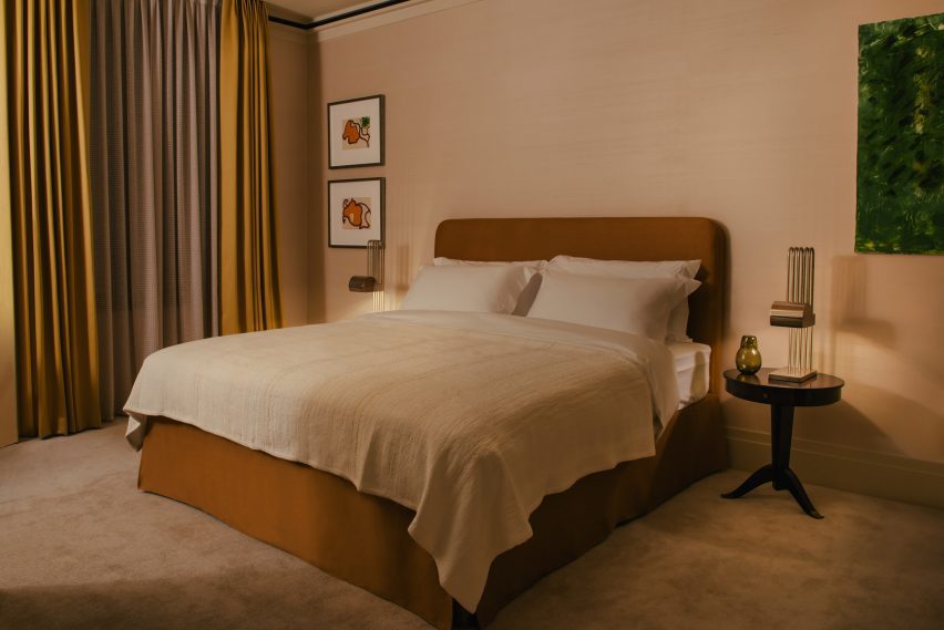 在客房里,厚重的芥末黄色窗帘与陶土色的床和两件带有棕色细节的床边艺术品相得益彰。