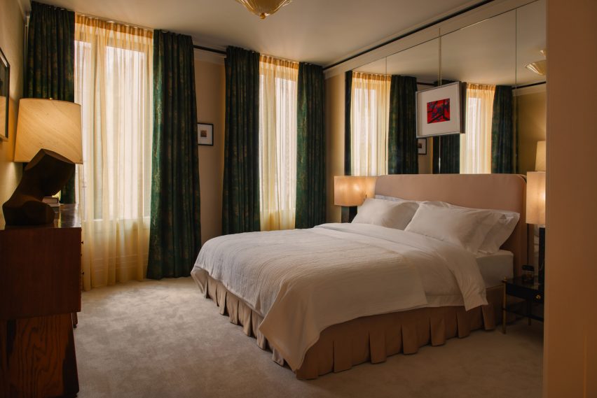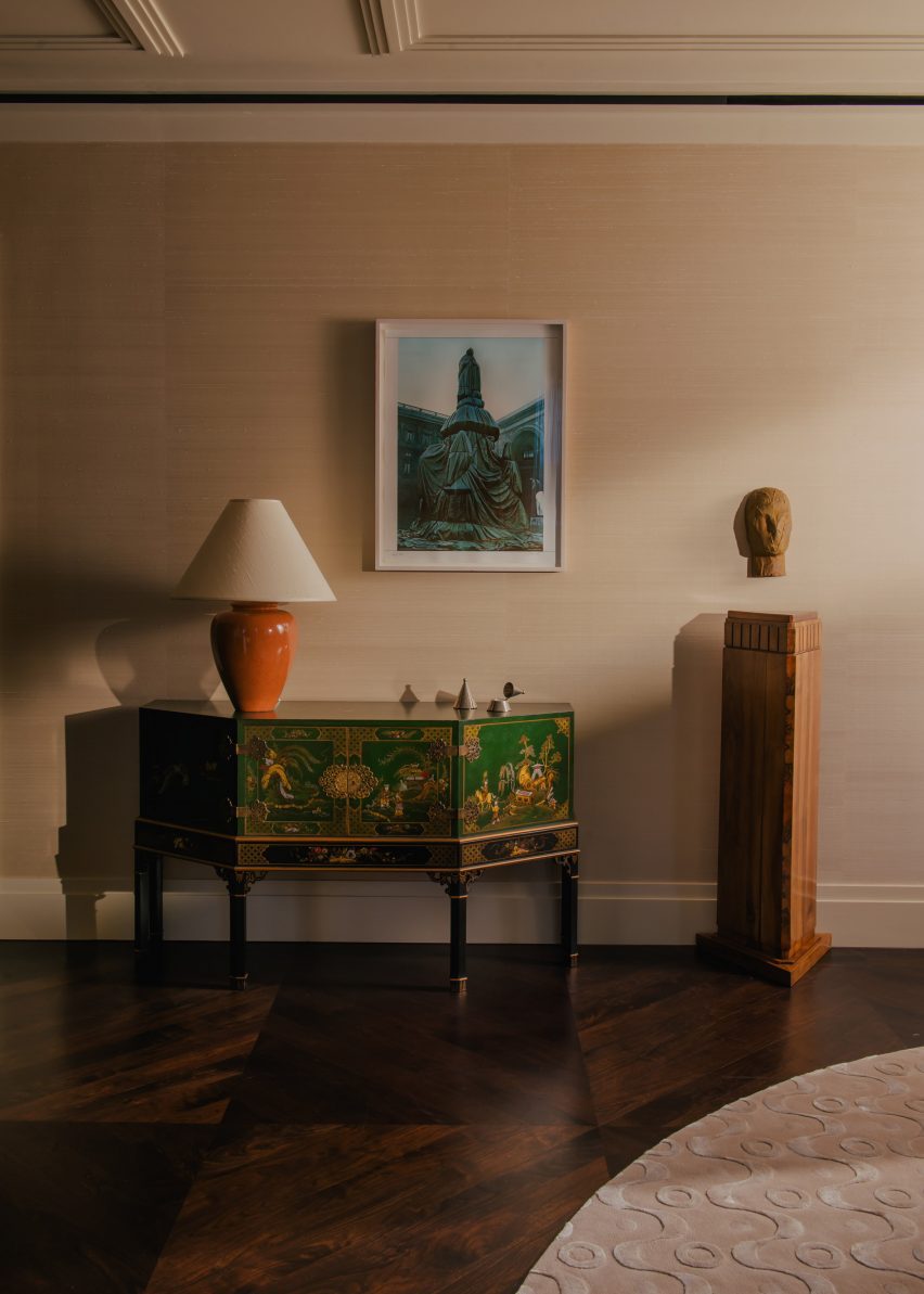 她说:“我在这个空间里放了两件最喜欢的古董;一件是客厅里20世纪30年代Jules Leleu床头柜上的现代主义台灯,另一件是绿色的中国风(chinoiseries)——它们真的定下了基调!”