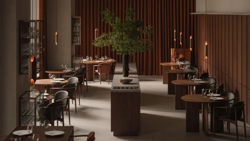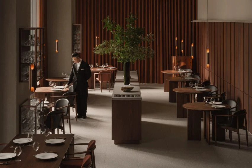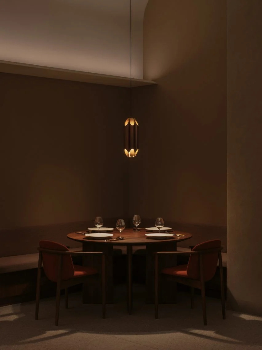 他说:“抹灰墙、砖元素和受竹子启发的照明设备都反映了这一概念。这家餐厅专为两到三个小时的亲密用餐体验而设计,在优雅、高天花板的空间中创造了一种隐私感。”