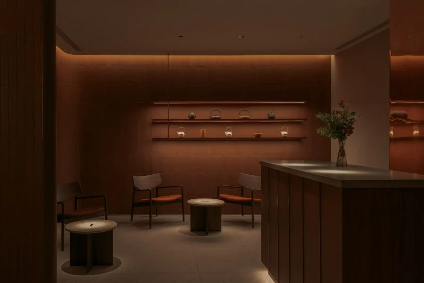 游客通过一个砖砌的等候区进入这个空间,在那里,筒子茶壶装饰着陶土色的墙壁。