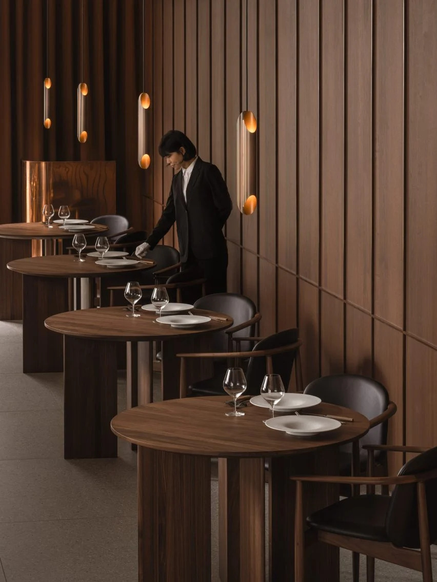 芦泽启治补充道:“壁挂式灯提供环境照明,而吊灯——数量因桌子大小而异——创造了一种个人用餐体验和有节奏的流动。”